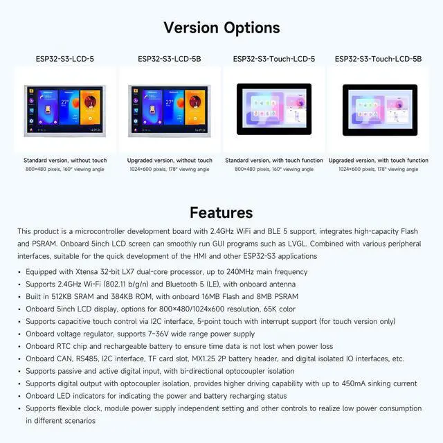 Memory & Storage: Equipped with 512KB SRAM, 384KB ROM, 16MB Flash, and 8MB PSRAM for ample storage and smooth execution of applications.