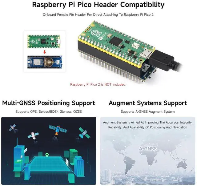 Multi-System GNSS Support: The Pico-GPS-L76K supports GPS, BeiDou (BDS), GLONASS, and QZSS, allowing for both multi-system combined positioning and independent single-system positioning for improved accuracy and reliability.