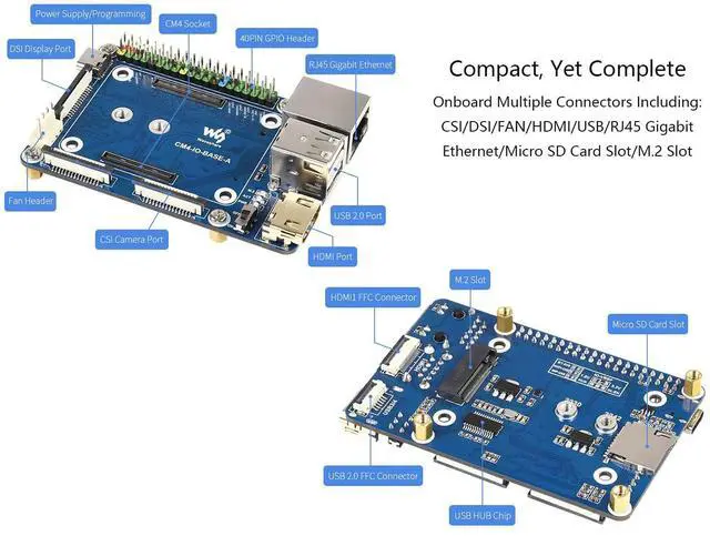 Onboard multiple connectors: CSI/DSI/FAN/HDMI/USB/RJ45 Gigabit Ethernet/Micro SD Card Slot/M. 2 Slot. Compared with version B, version A has fewer functions. Without RTC, FAN controller and battery holder