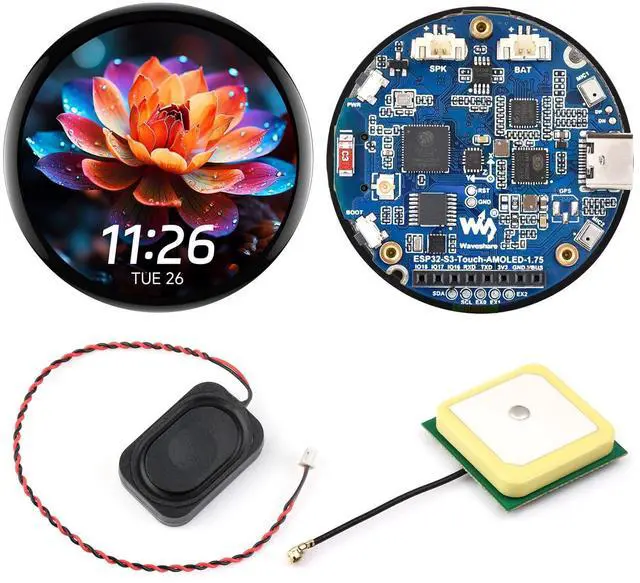 Waveshare ESP32-S3 1.75 inch AMOLED Round Touch Display Development Board, 32-bit LX7 Dual-core, 466×466, QSPI, Dual Digital Microphones Array, ESP32 with Display, with GPS