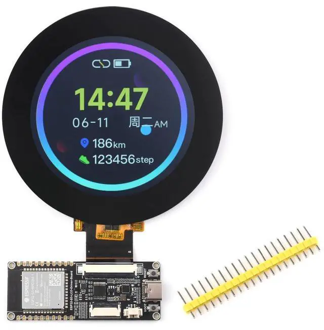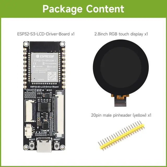 This comes with a 2.8inch RGB round touch display. For more detailed part list, please refer to the Package Content image