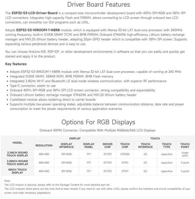 Waveshare ESP32-S3 RGB LCD Driver Board, Equipped with 32-Bit 240MHz LX7 Dual-Core Processor, 8MB PSRAM and Flash, WiFi & Bluetooth Support, Comes with a 2.8 inch RGB Round Touch Display