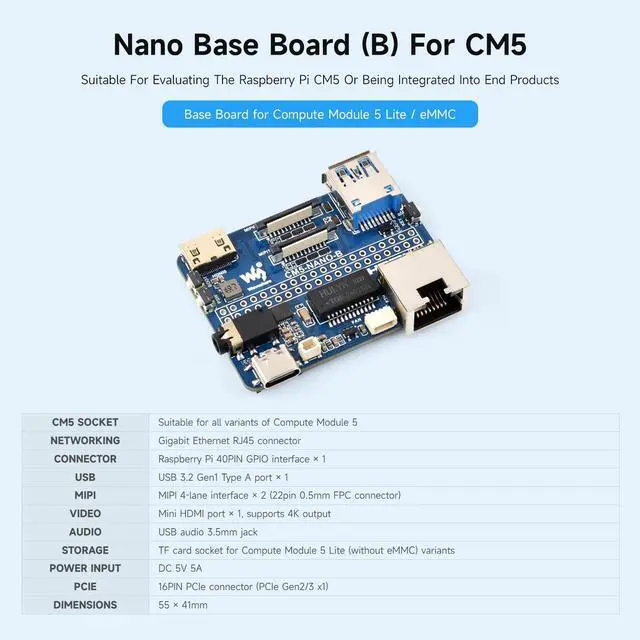 Waveshare Nano Base Board (B), Compatible with Raspberry Pi Compute Module 5, Same Size As The CM5, Base Board for Compute Module 5 Lite/eMMC