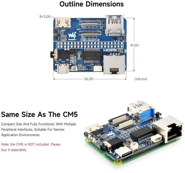 • Power and Dimensions: Powered by a DC 5V 5A input, with compact dimensions of 55 × 41mm.