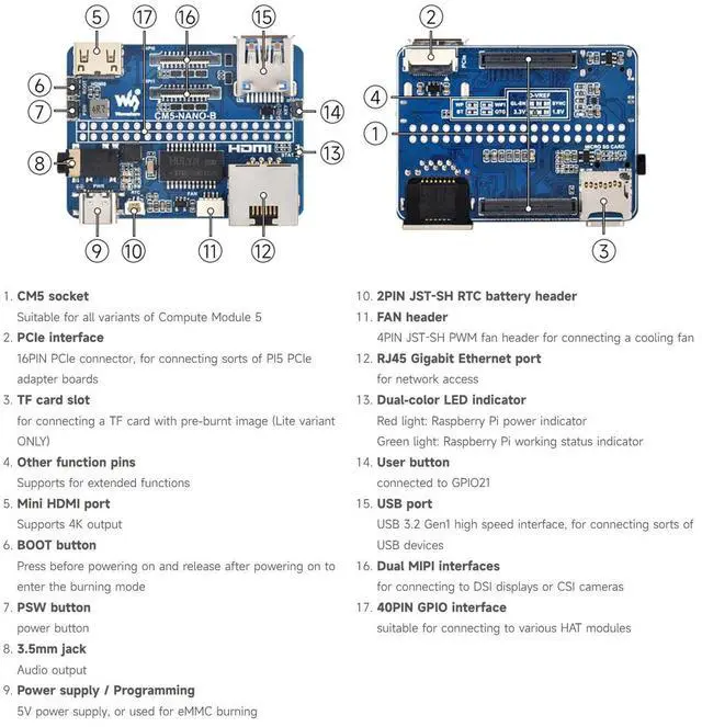 • Storage and Expansion: Offers a TF card socket for Compute Module 5 Lite variants (without eMMC) and a 16-pin PCIe connector (PCIe Gen2/3 x1).