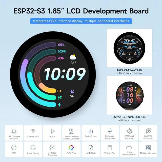 Onboard 1.85inch LCD display, 360×360 resolution, 262K color. Optional for capacitive touch function controled via I2C interface, with interrupt support