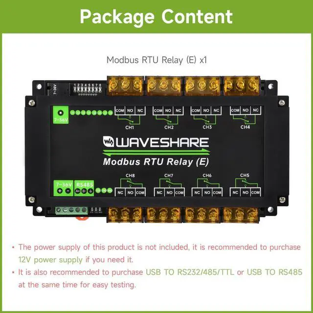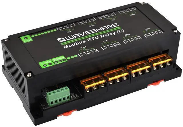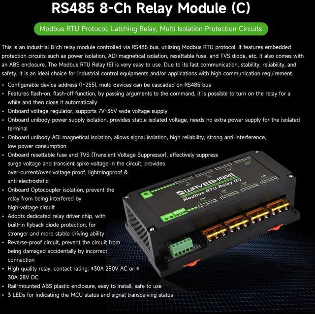 Waveshare Industrial Modbus RTU 8-ch Relay Module (E) with RS485, 30A High Current, Multi Isolation Protection, Optocoupler Isolation, Flyback Diode Protection, Rail-Mounted Case.
