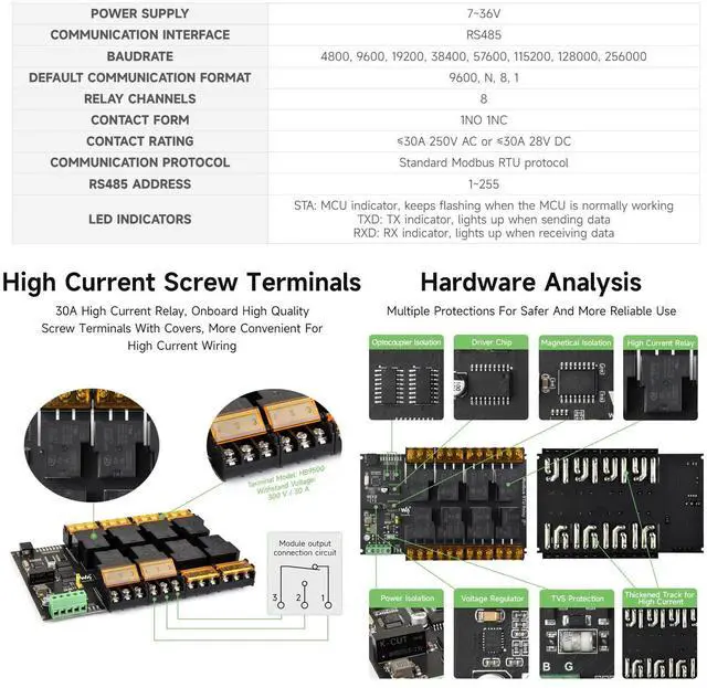 Surge Protection & Safety Features: Equipped with a resettable fuse, TVS (Transient Voltage Suppressor), optocoupler isolation, and reverse-proof circuit for protection against over-voltage, over-current, lightning, electrostatic discharge, and accidental miswiring.