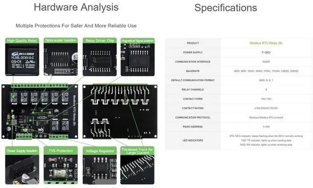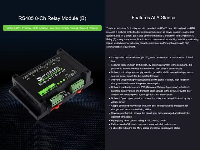 Industrial Modbus RTU 8-ch Relay Module (B) with RS485 Interface, Modbus RTU Protocol, Multi Isolation Protection Circuits, 7~36V Power Supply, Safe & Stable & Reliable