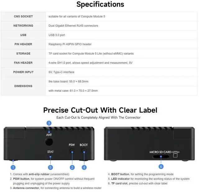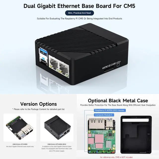 Raspberry Pi Compute Module 5 Compatibility: The CM5-DUAL-ETH-MINI is specifically designed to support all versions of the Raspberry Pi Compute Module 5 (CM5). This provides flexibility for users to integrate the CM5 with various hardware setups based on their requirements.