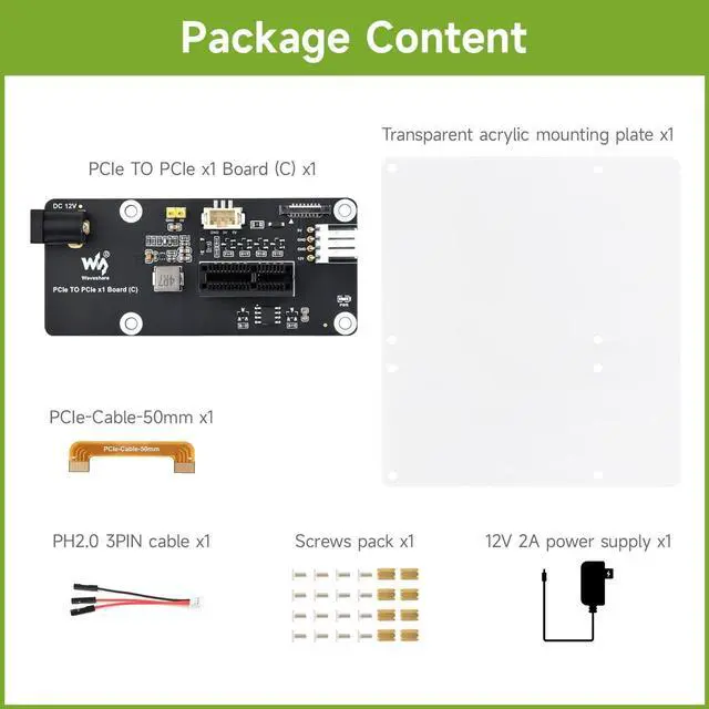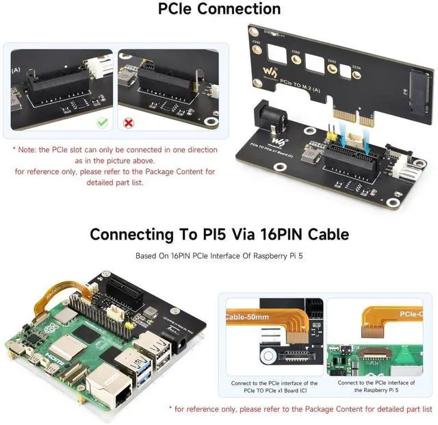 Images for reference only, please refer to the Package Content for detailed part list ^^ Based on 16PIN PCIe Interface of Raspberry Pi 5 ^^ Onboard PCIe x1 slot, with opening for connecting with PCIe x1 x4 x8 x16 devices ^^ The 12V header and DC jack only supply power to the 12V pins of the PCIe slot and do not provide power to the 5V and 3.3V pins ^^