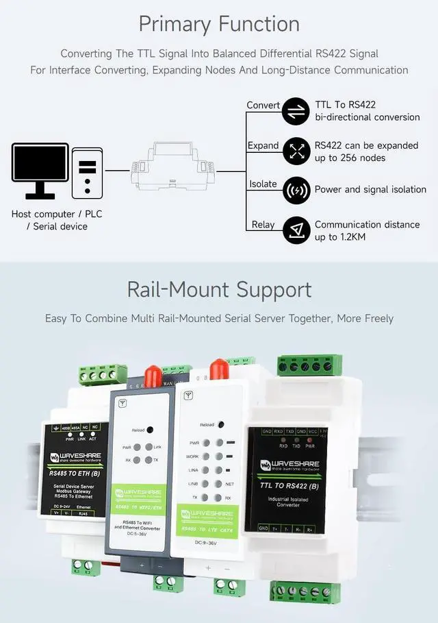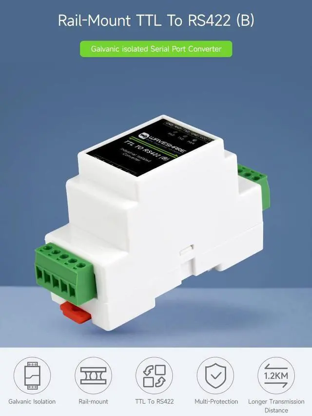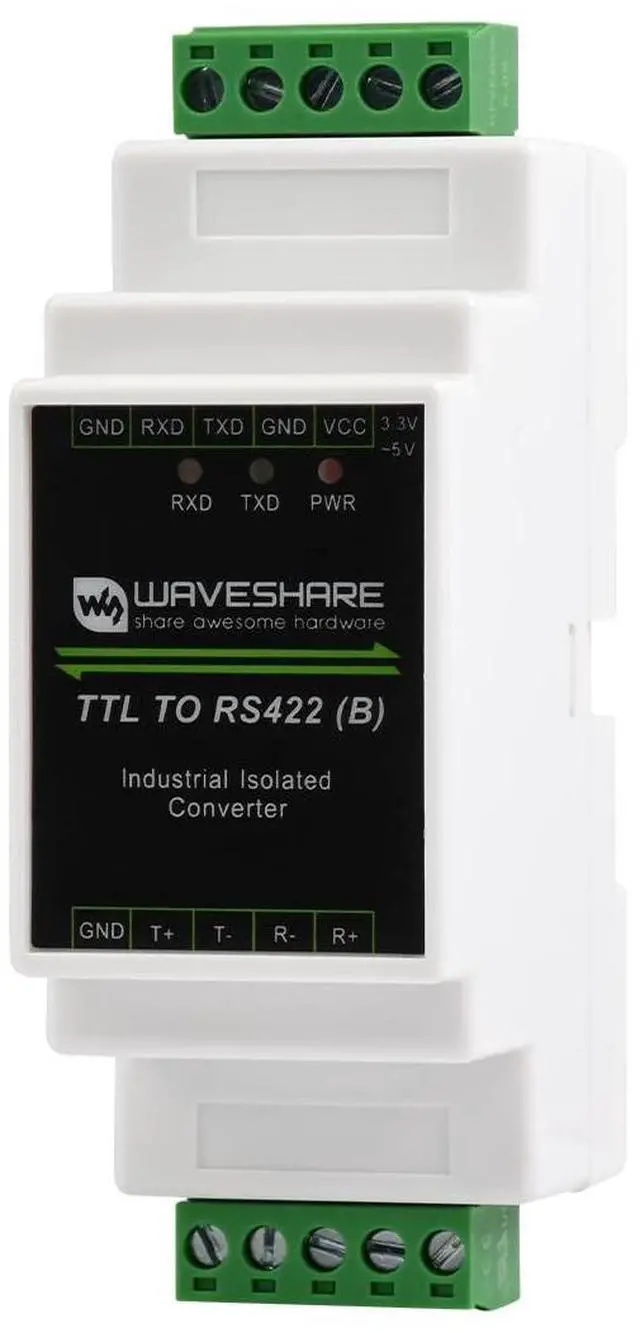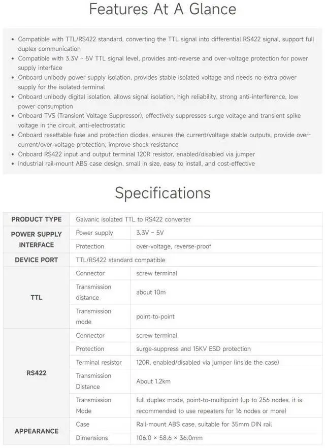 Compatible with TTL/RS422 standard, converting the TTL signal into differential RS422 signal, support full duplex communication. Compatible with 3.3V ~ 5V TTL signal level, provides anti-reverse and over-voltage protection for power supply interface ^^ Onboard unibody power supply isolation, provides stable isolated voltage and needs no extra power supply for the isolated terminal. Onboard unibody digital isolation, allows signal isolation, high reliability, strong anti-interference, and low power consumption ^^ Onboard TVS (Transient Voltage Suppressor), effectively suppresses surge voltage and transient spike voltage in the circuit, anti-electrostatic. Onboard RS422 input and output terminal 120R resistor, enabled/disabled via jumper ^^ Onboard resettable fuse and protection diodes, ensures the current/voltage stable outputs, provide over-current/over-voltage protection, improve shock resistance ^^ Industrial rail-mount ABS case design, small in size, easy to install, and cost-effective.