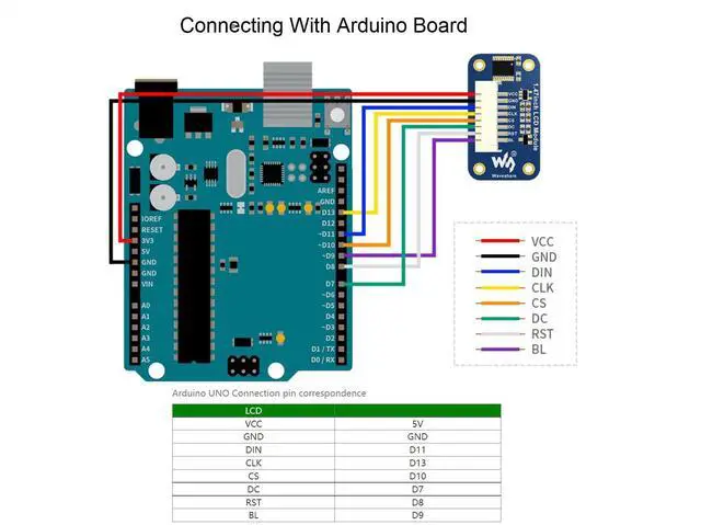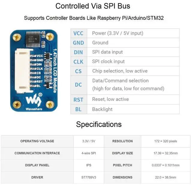 Comes with development resources (examples for Raspberry Pi/Arduino/STM32), please check it on the online user manual. ^^ SPI interface, minimizes required IO pins, supports controller boards like Raspberry Pi/Arduino/STM32 ^^ 172320 resolution, 262K RGB colors, clear and colorful displaying effect ^^