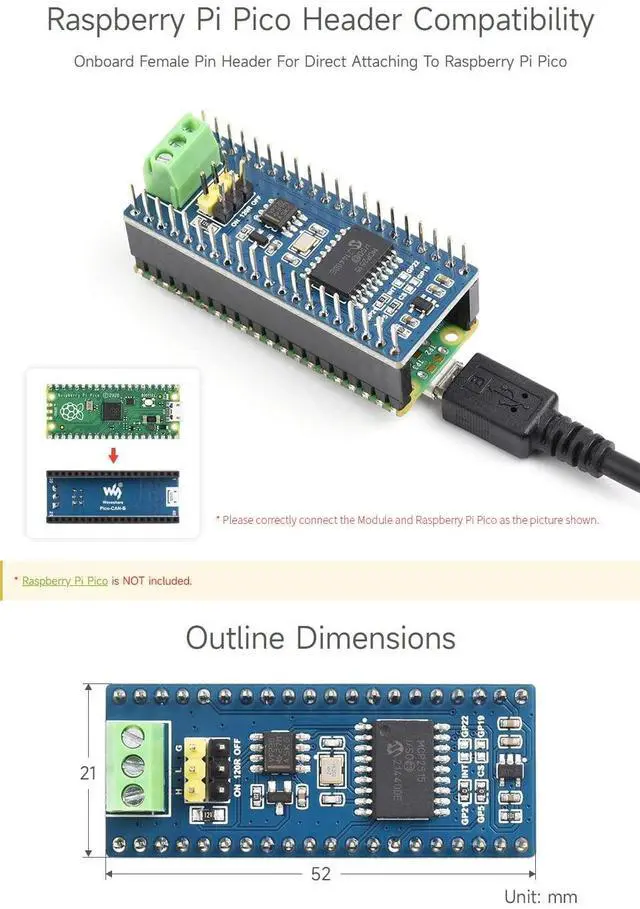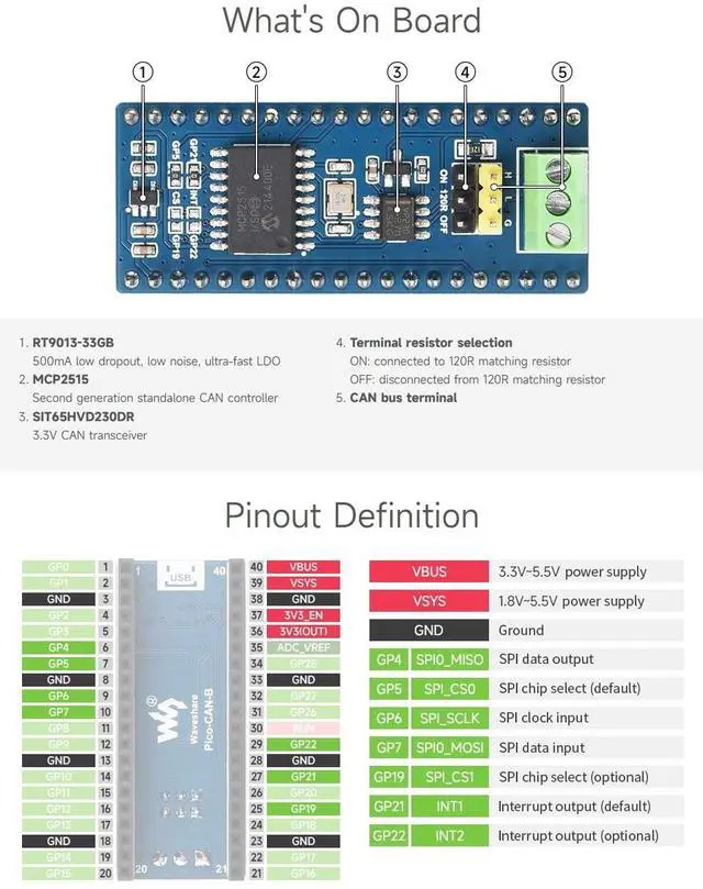 Standard Raspberry Pi Pico header, supports Raspberry Pi Pico series boards ^^ Features CAN function, adopts SPI interface CAN controller MCP2515 with transceiver SIT65HVD230DR ^^ Comes with online development resources and manual (Raspberry Pi Pico C/C++ and MicroPython examples) ^^ Onboard Female Pin Header For Direct Attaching To Raspberry Pi Pico