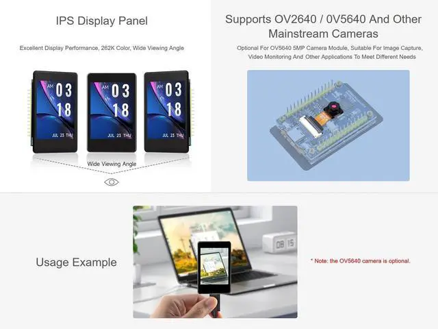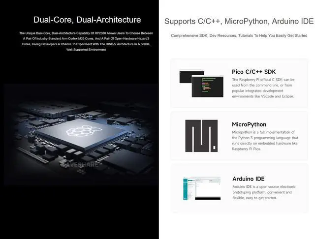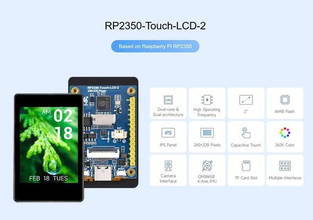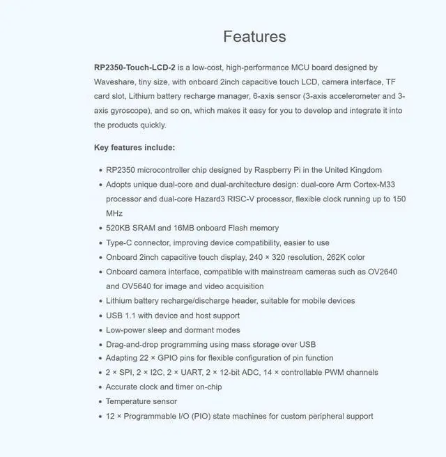 OverviewRP2350-Touch-LCD-2 is a low-cost, high-performance MCU board designed by Waveshare, tiny size, with onboard 2inch capacitive touch LCD, camera interface, TF card slot, battery recharge manager, 6-axis sensor (3-axis accelerometer and 3-axis gyroscope), and so on, which makes it easy for you to develop and integrate it into the products quickly. FeaturesBased on Raspberry Pi RP2350 microcontroller chipAdopts unique dual-core and dual-architecture design: dual-core Arm Cortex-M33 processor and dual-core Hazard3 RISC-V processor, flexible clock running up to 150 MHz520KB S-R-A-M and 16MB onboard Flash memoryType-C connector, improving device compatibility, easier to useOnboard 2inch capacitive touch display, 240 320 resolution, 262K colorOnboard camera interface, compatible with mainstream cameras such as OV2640 and OV5640 for image and video acquisitionLithium battery recharge/discharge header, suitable for mobile devicesUSB 1.1 with device and host supportLow-power sleep and dormant modesDrag-and-drop programming using mass storage over USBAdapting 22 GPIO pins for flexible configuration of pin function2 SPI, 2 I2C, 2 UART, 2 12-bit ADC, 14 controllable PWM channelsAccurate clock and timer on-chipTemperature sensor12 Programmable I/O (PIO) state machines for custom peripheral supportPackage