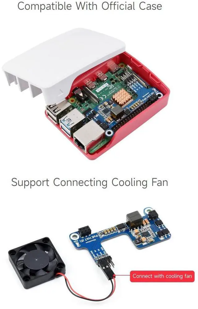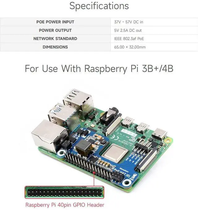Supports Raspberry Pi 3B+/4B, compatible with the Raspberry Pi official case ^^ PoE (Power Over Ethernet) capabilityIEEE 802.3 af-compliant ^^ Fully isolated switched-mode power supply (SMPS) ^^ Smaller and more flexible with a more compact component layout ^^ By using this small HAT and some proper 802.3 af-compliant power sourcing equipments, it is possible to provide both network connection and power supply for your Raspberry Pi in only one Ethernet cable.