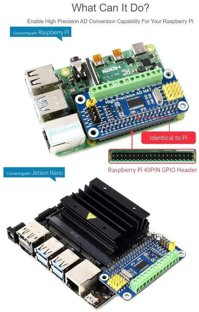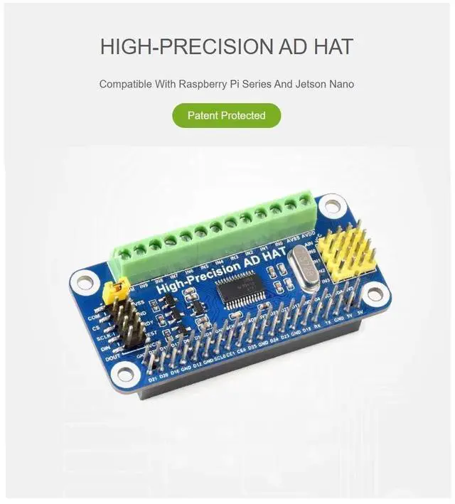 VOLTAGE RANGE (MIN): - 2.5V, 0VPackage ContentHigh-Precision AD HAT x1RPi screws pack (2PCS) x1Noteaspberry Pi and Jetson Nano are NOT included. Development Resources are providedplease contact with us via buyer message to get.