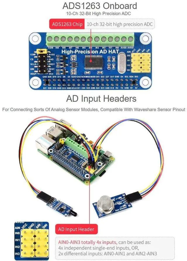 Compatible With Raspberry Pi Series And Jetson Nano, Enable High Precision AD Conversion Capability For Your Raspberry Pi2. ADS1263 Onboard10-Ch 32-Bit High Precision ADC3. AD Input HeadersFor Connecting Sorts Of Analog Sensor Modules, Compatible With Waveshare Sensor Pinout4. AD Input Screw TerminalFor Connecting Analog Signal And Analog Power Supply, General