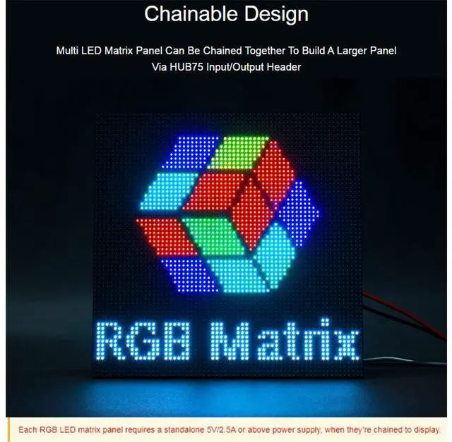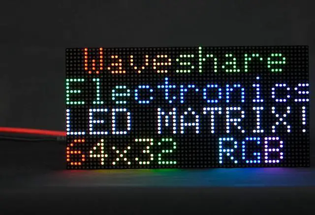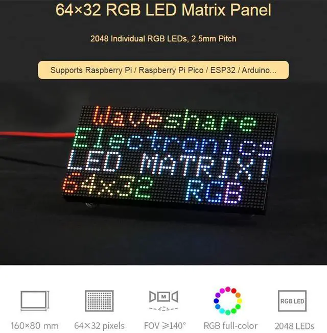 6432 RGB LED Matrix Panel, 2048 Individual RGB LEDs, 2.5 mm Pitch. Compatible with Arduino/ Raspberry Pi / Raspberry Pi Pico / ESP32. FeaturesBy nightfall, the dazzling neon lights of the streets and alleys illuminate the whole city making it more dynamic. Obviously, the Full-Color LED Matrix Panel is playing an important role. Maybe be on the doors of shops, maybe be on the bus or the taxi, you can always see animations or advertisement videos. Does it look cool? Why not have a try? 2048 individual RGB LEDs, full-color display, adjustable brightness6432 pixels, 2.5 mm pitch, allows displaying text, colorful image, or animation16080mm dimensions, moderate size, suitable for DIY desktop display or wall mount displayOnboard two HUB75 header, one for controller data input, one for output, chain supportProvides open source development resources (examples for Raspberry Pi / Raspberry Pi Pico / ESP32 / Arduino)SpecificationsDIMENSIONS--- 160mm 80mmPIXELS--- 6432=2048 DOTSPITCH--- 2.5 mmPIXEL FORM--- 1R1G1BVIEWING ANGLE--- 140CONTROL TYPE---synchronizationDRIVING--- 1/16 scanHEADER--- HUB75POWER SUPPLY---5V / 2.5A (VH4 header input) POWER--- 12WPackage ContentRGB-Matrix-P 2.5 -64x32 LED matrix and accessories x1Power supply terminal adapter x116P wire ~30cm x1