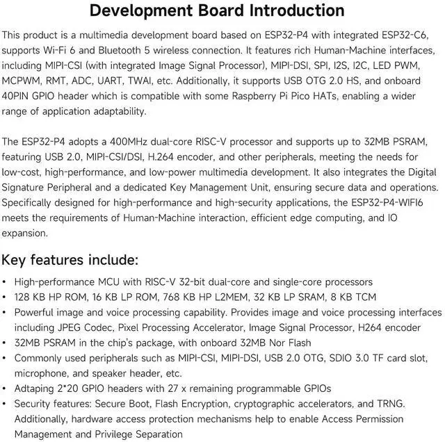 Security: Equipped with essential peripherals such as MIPI-CSI, USB 2.0 OTG, and SDIO 3.0, along with advanced security features like Secure Boot, Flash Encryption, and cryptographic accelerators.