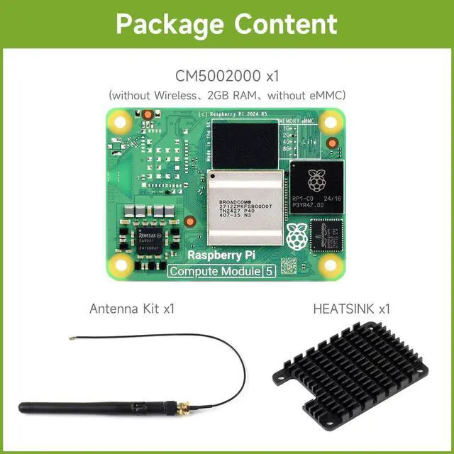2GB RAM, 0GB (Lite) eMMC Flash, without WIFI ^^ Raspberry Pi Compute Module 5 is a system on module (SoM) that delivers the power of Raspberry Pi 5 in a compact form factor, integrates a quad-core Arm Cortex-A76 processor, providing a variety of RAM and eMMC flash options, supports power circuitry and a rich set of interfaces. ^^ Compute Module 5 enables you to leverage Raspberry Pi 5's powerful hardware and optimised software stack in your own custom systems and form factors. ^^ Upgraded processor BCM2712, quad-core Cortex-A76 64-bit SoC, more powerful performance More options for RAM (2GB / 4GB / 8GB / 16GB) More options for eMMC Flash (0GB (Lite) / 8GB / 16GB / 32GB / 64GB) ^^ Faster eMMC Flash storage, up to 200 Mbps data rate Optional for certified radio module, supports either PCB trace antenna or external antenna, more suitable for industrial applications Adopts B to B connectors, most compatible with Compute Module 4 ^^ Onboard Gigabit Ethernet PHY supporting IEEE1588, suitable for network applications Onboard PCIe Gen 2 x1 interface, allows connecting more useful modules ^^
