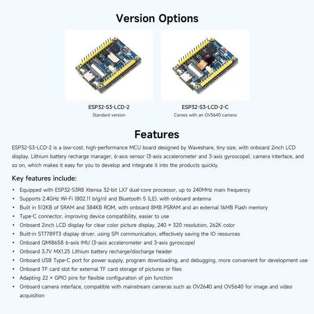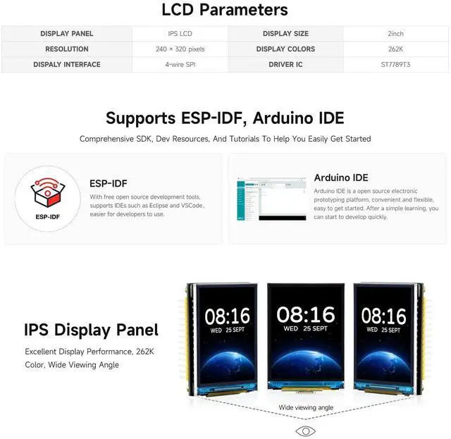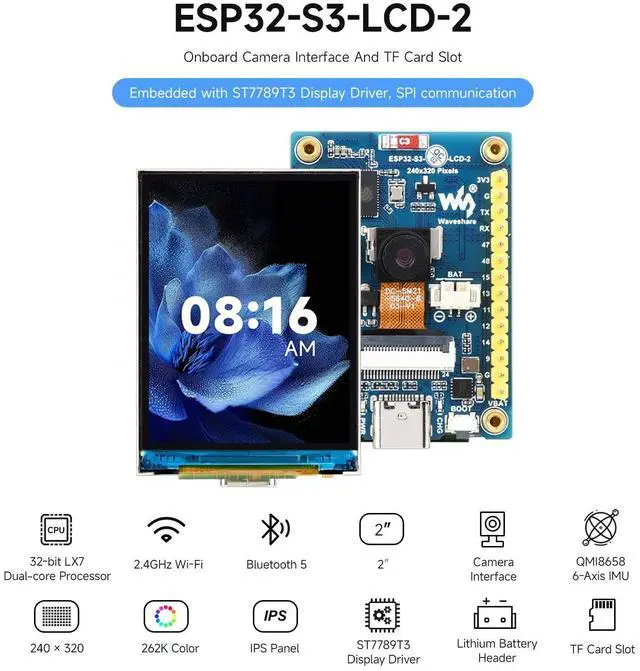 Equipped with ESP32-S3R8 Xtensa 32-bit LX7 dual-core processor, up to 240MHz main frequency. Supports 2.4GH z Wi-Fi ( 802.11 b/g/n) and BT 5 (LE), with onboard antenna ^^ Built in 512KB of Static RAM and 384KB ROM, with onboard 8MB PStatic RAM and an external 16MB Flash memory. Type-C connector, improving device compatibility, easier to use. Onboard 2inch LCD display for clear color picture display, 240 x 320 resolution, 262K color ^^ Built-in ST7789T3 display driver, using SPI communication, effectively saving the IO resources. Onboard QMI8658 6-axis IMU (3-axis accelerometer and 3-axis gyroscope).