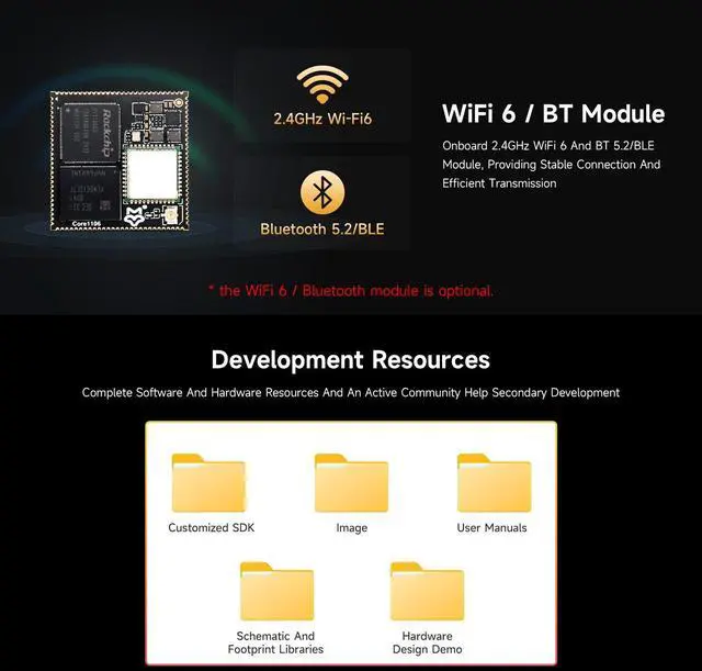There are several options for this item, this option is 256MB memory and without wireless. For more details, please check the 'package content' image. ^^ The Core1106 is a core board based on the Rockchip RV1106 series chips, featuring high performance and high expandability, provides a convenient platform for developers to design their own hardware, enabling quick design verification or direct integration into products, thereby shortening the R&D cycle. ^^ Adapting various interfaces via castellated holes, such as MIPI CSI, RGB LCD, GPIO, UART, SPI, I2C, USB, Ethernet port, and SDIO, etc.