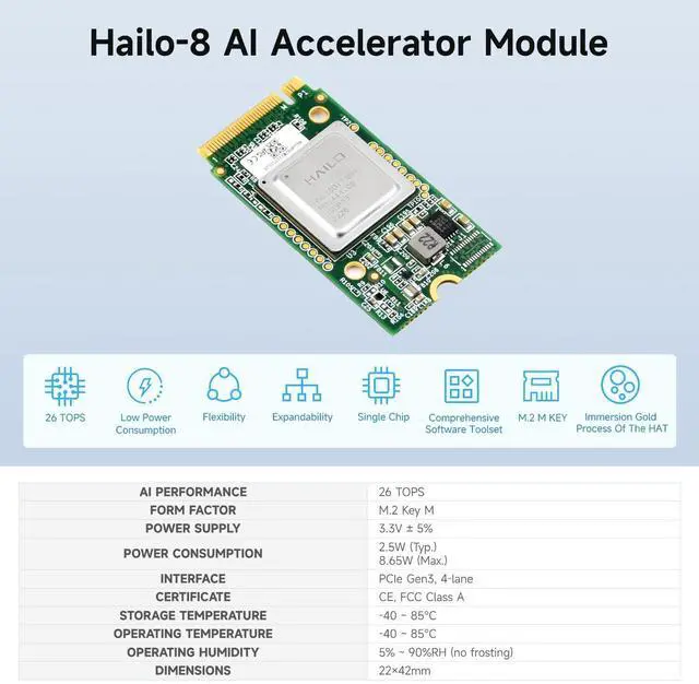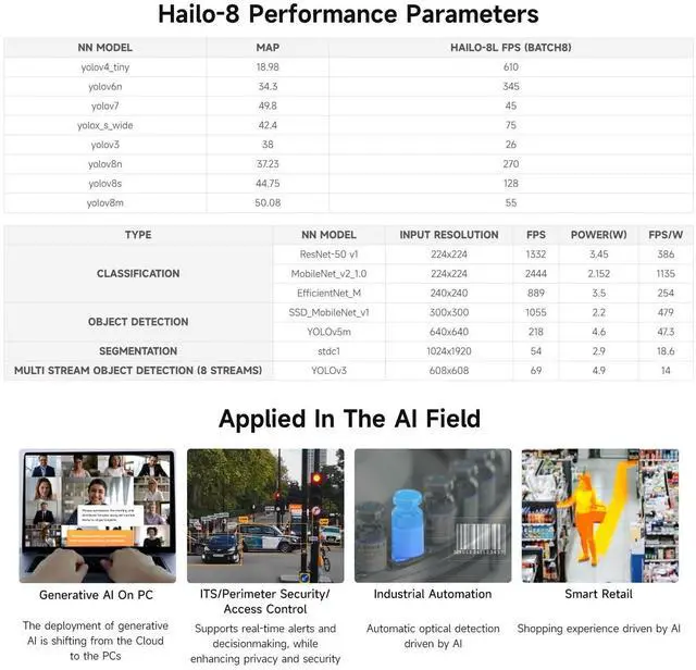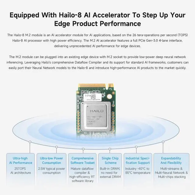 Powered by 26 Tera-Operations Per Second (TOPS) Hailo-8 AI Processor. 2.5W typical power consumption ^^ Scalable, enabling simultaneous processing of multi-streams & multi-models ^^ Enabling real-time, low latency and high-efficiency AI inferencing on the edge devices ^^ Supports TensorFlow, TensorFlow Lite, ONNX, Keras, Pytorch frameworks ^^ Supports Linux and Windows. Supports the temperature range of -40C to 85C ^^ Rich WiKi Resources We provide official Wiki resources, please contact us for more information.