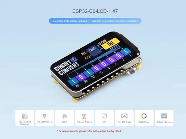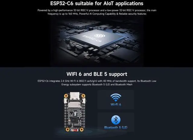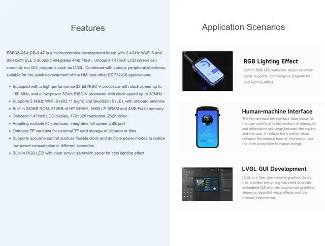 OverviewESP32-C6-LCD- 1.47 is a microcontroller development board with 2.4GH z Wi-Fi 6 and Bluetooth BLE 5 support, integrates 4MB Flash. Onboard 1.47 inch LCD screen can smoothly run GUI programs such as LVGL. Combined with various peripheral interfaces, suitable for the quick development of the HMI and other ESP32-C6 applicationsFeaturesEquipped with a high-performance 32-bit RISC-V processor with clock speed up to 160 MHz, and a low-power 32-bit RISC-V processor with clock speed up to 20MHzSupports 2.4GH z Wi-Fi 6 ( 802.11 b/g/n) and Bluetooth 5 (LE), with onboard antennaBuilt in 320KB ROM, 512KB of HP Static Random-Access Memory, 16KB LP Static Random-Access Memory and 4MB Flash memoryOnboard 1.47 inch LCD display, 172320 resolution, 262K colorAdapting multiple IO interfaces, integrates full-speed USB portOnboard TF card slot for external TF card storage of pictures or filesSupports accurate control such as flexible clock and multiple power modes to realize low power consumption in different scenariosBuilt-in RGB LED with clear acrylic sandwich panel for cool lighting effectPackage