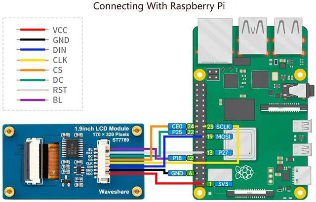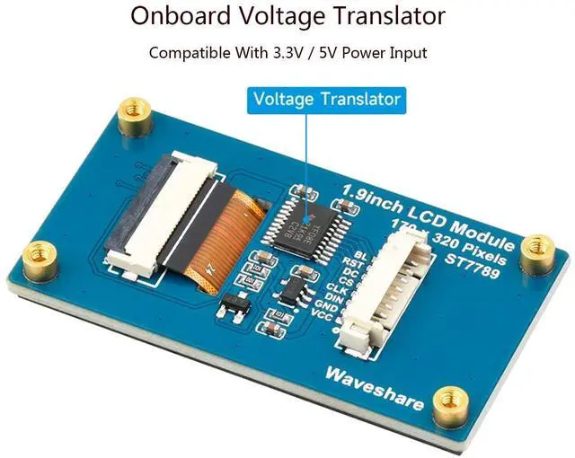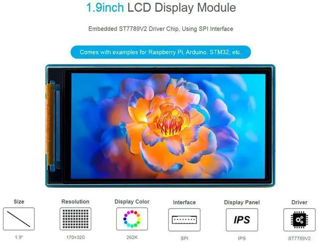 1.9 inch LCD Display Module, 170320 Resolution, SPI Interface, IPS, 262K ColorsFeatures170320 resolution, 262K colors, clear and colorful displaying effectSPI interface, minimizes required IO pins, supports controller boards like Raspberry Pi/Arduino/STM32Comes with online development resources (examples for Raspberry Pi/Arduino/STM32)SpecificationsOPERATING VOLTAGE-- 3.3V / 5VNote: (Please ensure that the power supply voltage is consistent with the logic voltage, otherwise it will not work normally.