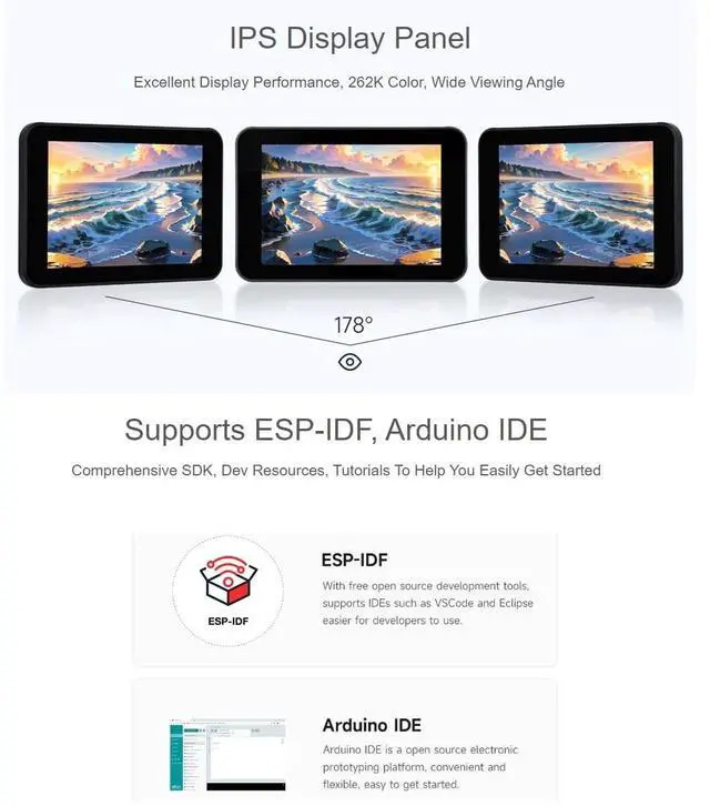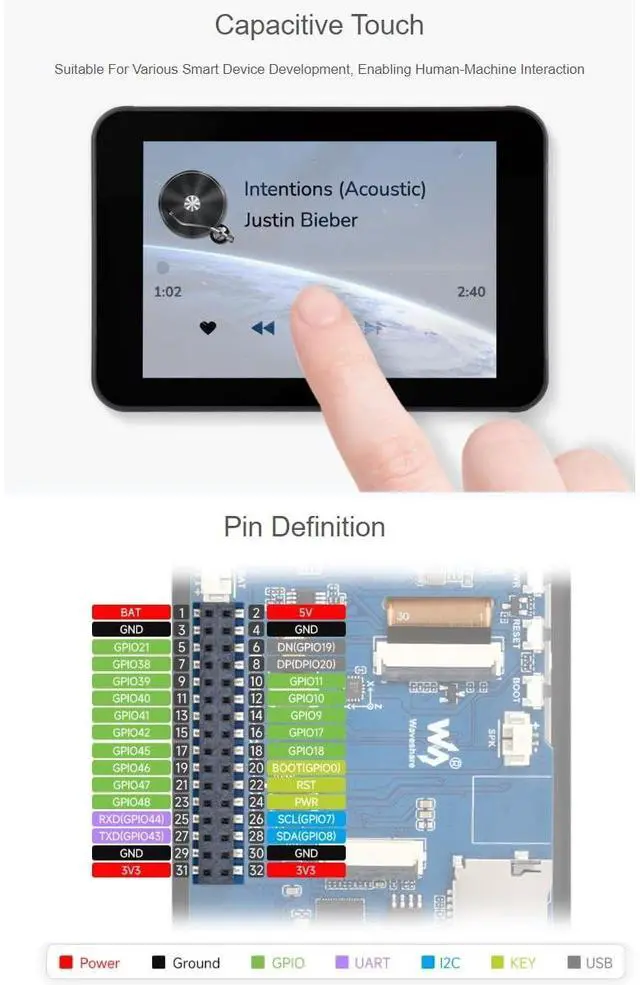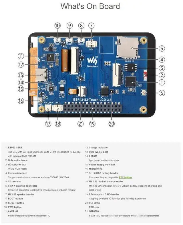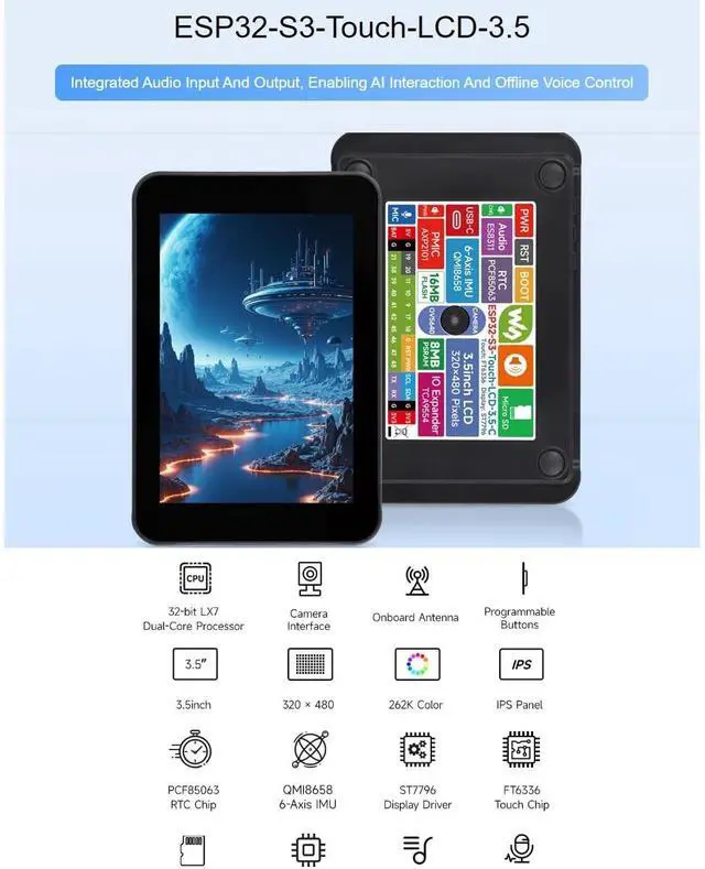 Key features include: Equipped with ESP32-S3R8 Xtensa 32-bit LX7 dual-core processor, up to 240MHz main frequencySupports 2.4GH z Wi-Fi ( 802.11 b/g/n) and Bluetooth 5 (LE), with onboard antennaBuilt in 512KB of SRAM and 384KB ROM, with onboard 8MB PSRAM and an external 16MB Flash memoryType-C connector, improving device compatibility, easier to useOnboard 3.5 inch capacitive touch display for clear color picture display, 320 480 resolution, 262K colorBuilt-in ST7796 display driver and FT6336 capacitive touch chip, using SPI and I2C communication respectively, effectively saving the IO resourcesOnboard QMI8658 6-axis IMU (3-axis accelerometer and 3-axis gyroscope) for detecting motion gestures, counting steps, etc. Onboard PCF85063 RTC chip, powered by main Lithium battery through AXP2101 chip, with reserved RTC battery header for connecting a backup battery, ensuring RTC function during the replacement of the main batteryOnboard PWR and BOOT programmable buttons for easy custom function developmentOnboard 3.7V MX 1.25 Lithium battery recharge/discharge headerAdapting I2C, UART, USB, and multiple GPIO pins, for connecting peripherals and debuggingOnboard TF card slot for extended storage and fast data transfer, suitable for applications such as data recording and media playback, simplifying circuit designOnboard camera interface, compatible with mainstream cameras such as OV2640 and OV5640Adopts AXP2101 IC for efficient power management, supports multiple voltage outputs, battery charging, battery management, and battery life optimization, etc.