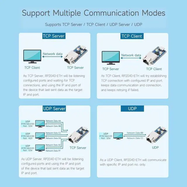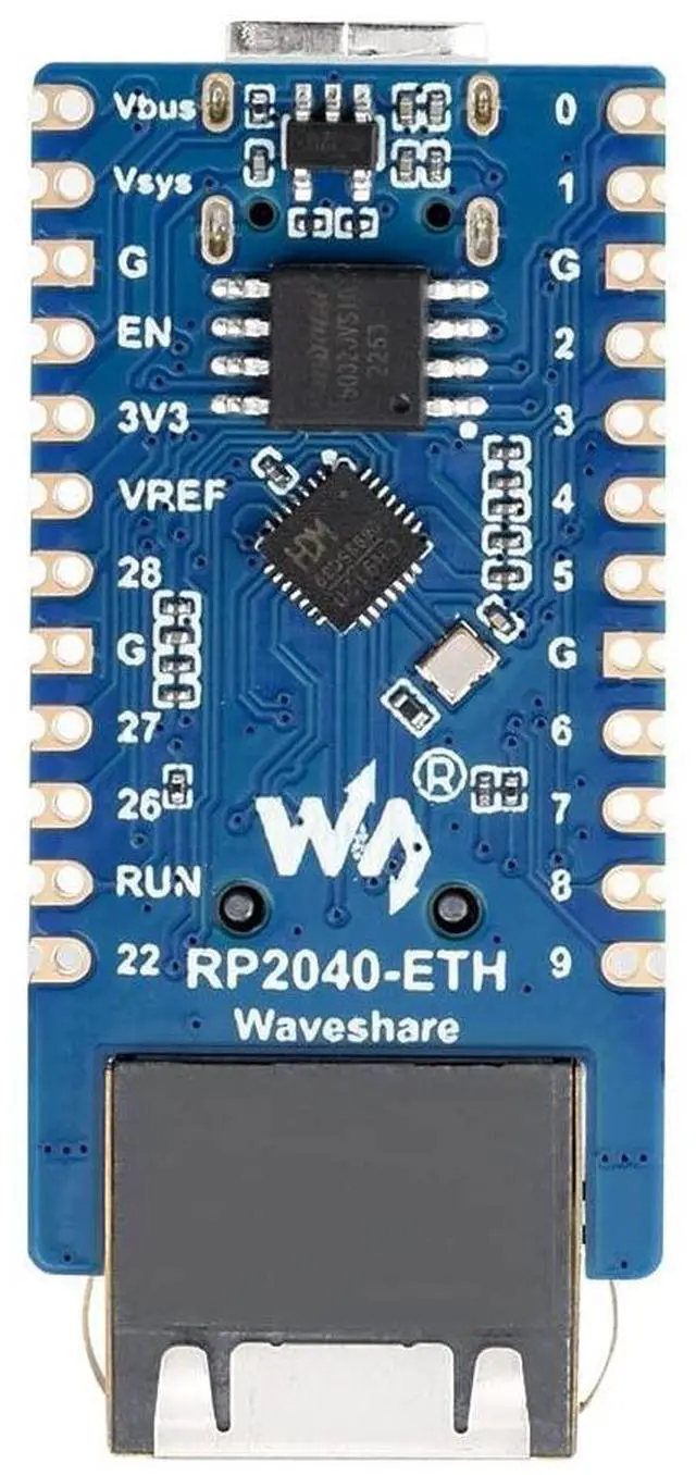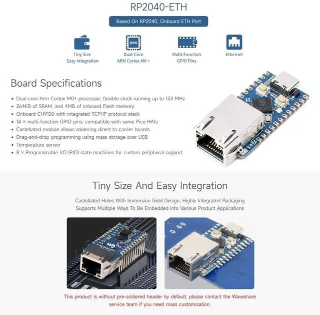 Dual-core Arm Cortex M0+ processor, flexible clock running up to 133 MHz ^^ 264KB of SRAM, and 4MB of onboard Flash memory. Onboard CH9120 with integrated TCP/IP protocol stack ^^ 14 multi-function GPIO pins, compatible with some Pico HATs. Castellated module allows soldering direct to carrier boards ^^ Drag-and-drop programming using mass storage over USB. Temperature sensor ^^ 8 Programmable I/O (PIO) state machines for custom peripheral support