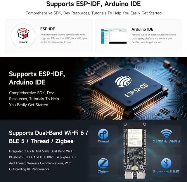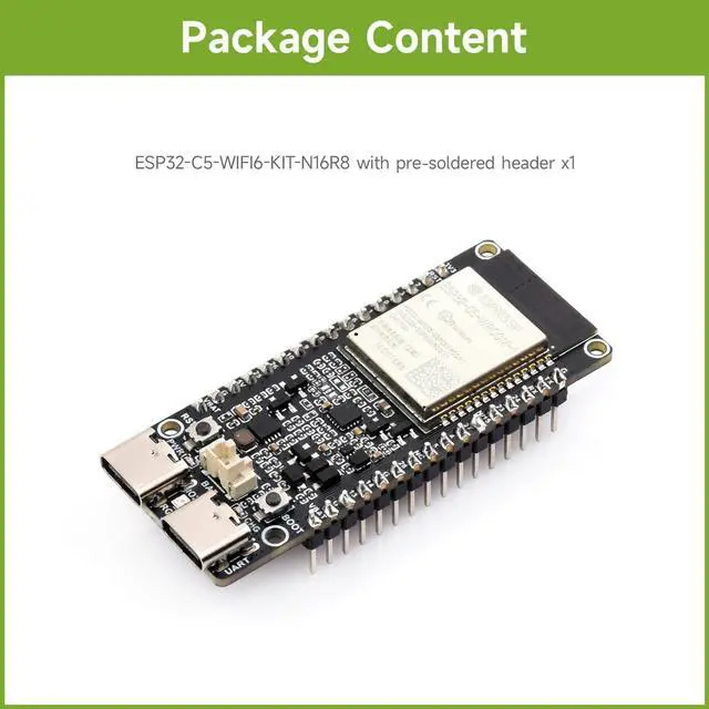 Ample PSRAM Storage The development board offers 8MB PSRAM, providing substantial extra memory for handling more complex tasks, large data buffers, and advanced processing. ^^ Enhanced Multi-Tasking Capability With the additional 8MB PSRAM, the ESP32-C5-WIFI6-KIT can efficiently manage multiple protocol stacks simultaneously, ensuring smooth operation in multi-tasking IoT environments. ^^ Support for Medium-Load Applications The 8MB PSRAM allows the ESP32-C5 to handle medium-load applications more effectively, making it ideal for scenarios requiring real-time data processing or continuous communication. ^^ Seamless Performance The increased memory improves the overall performance and responsiveness of the device, particularly when running applications with larger memory footprints or more demanding computations.