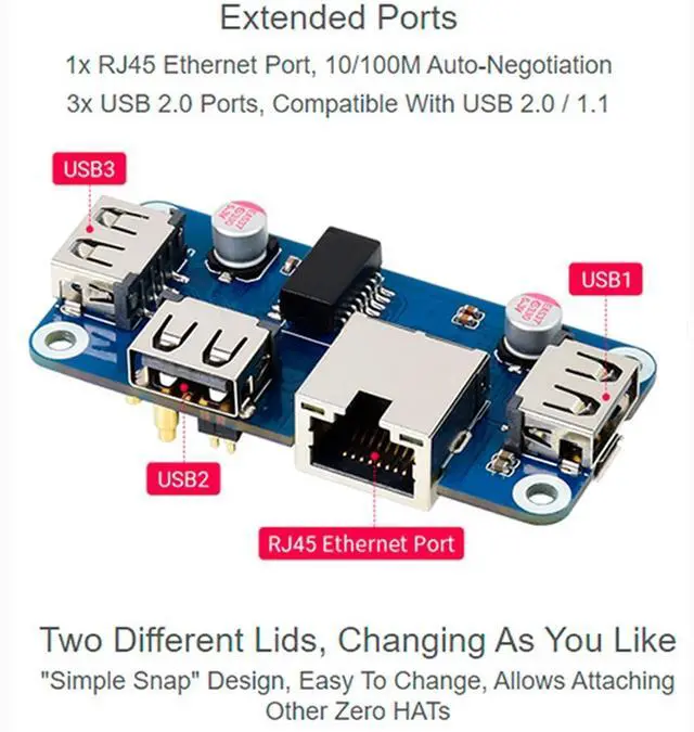Incorporates RTL8152B Ethernet chip, supports 1x RJ45 Ethernet port, 10/100M auto-negotiation4) Pogo pin design, for direct connecting with Raspberry Pi Zero/Zero W/Zero WH5) Angle rounded design, smooth hand feeling, "simple snap" case lid6) Quality ABS material, dull polish surface, anti-fingerprint7) Comes with two different lids, changing as you likeOnline Development Resources /User
