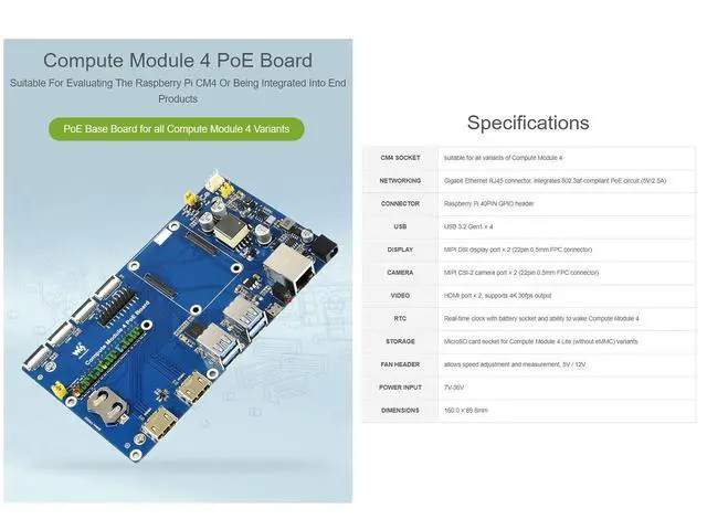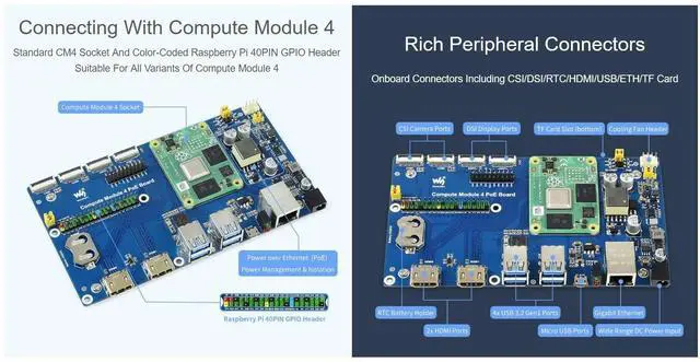 Suitable For Evaluating The Raspberry Pi CM4 Or Being Integrated Into End Products ^^ Standard CM4 Socket And Color-Coded Raspberry Pi 40PIN GPIO Header. Suitable For All Variants Of Compute Module 4 ^^ Onboard Connectors Including CSI/DSI/RTC/HDMI/USB/ETH/TF Card ^^ Suitable For PoE Powered Raspberry Pi Projects, Or Other Industrial Context