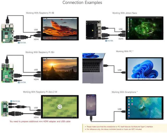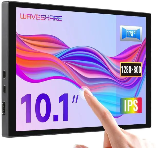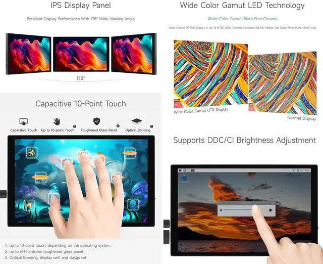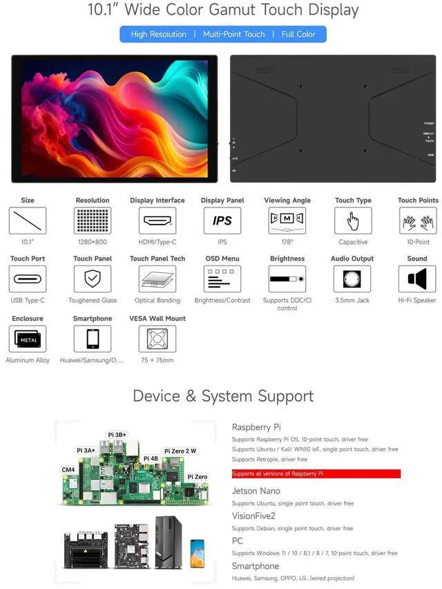 10.1 inch Capacitive Touch Display, Wide Color Gamut, 1280800, Optical Bonding Toughened Glass Panel, HDMI/Type-C Display Interface, 10-Point Touch, Aluminum Alloy Case ^^ Supports all versions of Raspberry Pi. Supports Jetson Nano, VisionFive2, PC (Windows 11 / 10 / 8.1 / 8 / 7) and Smartphone ^^ Excellent Display Performance With 178 Wide Viewing Angle ^^ Color Gamut Of This Display Is Up To NTSC 82%, Chroma Increases 58.3 %, Makes The Color More Pure, More Vivid ^^ Up to 10-point touch, depending on the operating system.