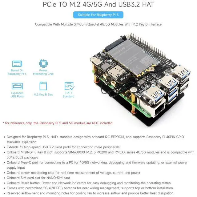 Designed for Raspberry Pi 5, HAT+ standard design with onboard I2C EEPROM, and supports Raspberry Pi 40PIN GPIO stackable expansion. Extends 3x high-speed USB 3.2 Gen1 ports for connecting more peripherals ^^ Onboard M. 2 (NGFF) Key B slot, supports SIM7600XX-M. 2, SIM82XX and RM5XX series 4G/5G modules and is compatible with 3042/3052 packages. Onboard Type-C port for connecting to a PC for 4G/5G networking, debugging and firmware updating, or external power supply input ^^ Onboard power monitoring chip for real-time measurement of voltage, current and power. Onboard SIM card slot for NANO-SIM card ^^ Onboard Reset button, Power and Network indicators for easy debugging and monitoring the operating status.