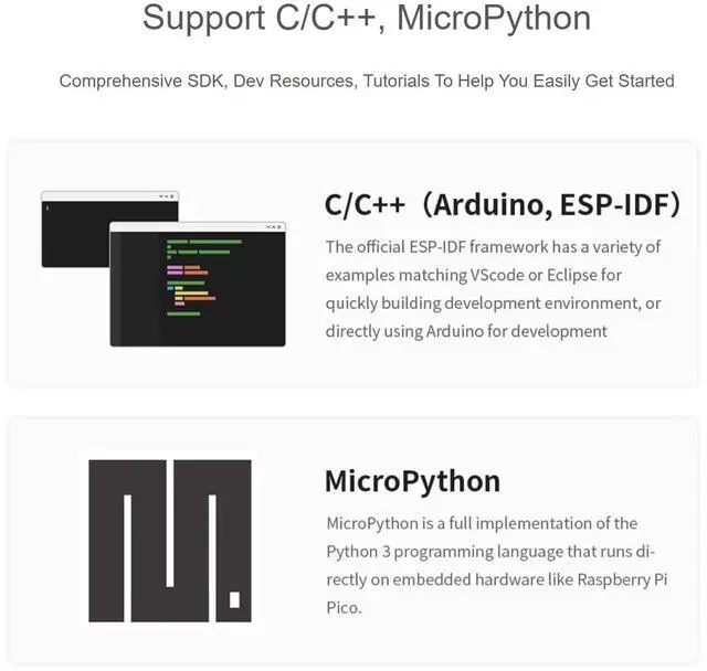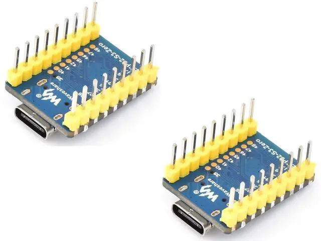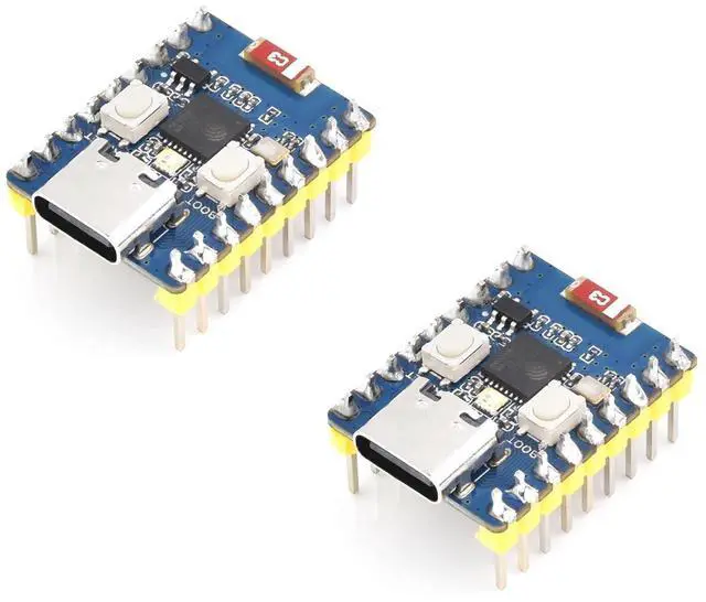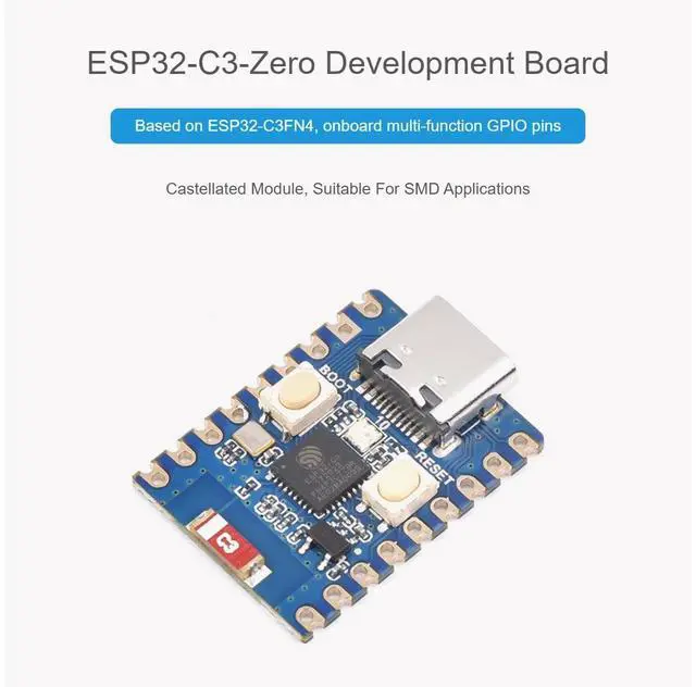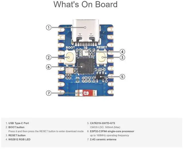 2 PCS ESP32-C3 Mini Development Board with pre-soldered header, Based On ESP32-C3FN4 Single-Core Processor, 160MHz Running Frequency, 2.4GH z Wi-Fi & Bluetooth 5 Features 1. ESP32-C3-Zero-M Development Board Based on ESP32-C3FN4, onboard multi-function GPIO pins Castellated Module, Suitable For SMD Applications 2. Support C/C++, MicroPython Comprehensive SDK, Dev Resources, Tutorials To Help You Easily Get Started What's On Board 1. USB Type-C Port 2. BOOT button Press it and then press the RESET button to enter download mode 3. RESET button 4. WS2812 RGB LED 5.