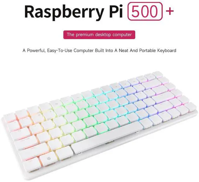 ^^ Programmable RGB Backlighting for Customization The built-in RGB backlighting is fully programmable with individually addressable LEDs, enabling users to customize lighting effects to match their preferences. Powered by the RP2040 controller running QMK firmware, it provides robust functionality for personalizing the keyboard's appearance and enhancing the user experience. ^^ User-Friendly Design with Easy Expansion The Raspberry Pi 500+ is designed for both ease of use and customization. Its internal storage is easily accessible via a plastic opening tool, allowing for convenient SSD replacement or upgrades. The keyboard's low-profile custom keycaps are spray-painted and laser-etched, allowing the backlight to shine through the characters for a stylish and functional design.