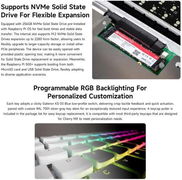 It also includes a keycap puller for easy key replacement and is compatible with most third-party keycaps designed for Cherry MX. ^^ Expandable NVMe Solid State Drive Pre-installed with a 256GB NVMe SSD and Raspberry Pi OS, the Raspberry Pi 500+ boasts fast boot times and stable data transfer. The device features an M. 2 NVMe slot supporting up to a 2280 form factor, allowing for easy expansion of storage or the addition of PCIe peripherals. It can also boot from both a MicroSD card and a USB SSD, offering versatile setup options.