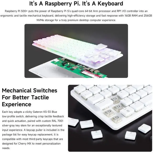 Raspberry Pi Power in a Compact Keyboard The Raspberry Pi 500+ combines the powerful quad-core 64-bit Arm processor of the Raspberry Pi 5 with the RP1 I/O controller, all integrated into a tactile mechanical keyboard. With 16GB of RAM and 256GB of NVMe storage, it offers a premium desktop computing experience, delivering both high efficiency and fast response times. ^^ Mechanical Switches for Enhanced Tactile Feedback Each key features a Gateron KS-33 Blue low-profile mechanical switch, offering a satisfying clicky sound and crisp tactile feedback. Paired with custom RAL 7001 silver-gray key stems, this keyboard ensures an exceptional typing experience.