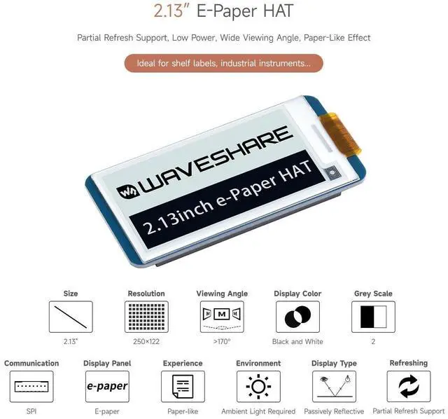 IMPORTANT: Rev 2.1 is the version of the driver board, which is independent of the screen version. Currently, there is only Rev 2.1; QC target V3 and V4 are screen versions, and V4 is currently being shipped. V4 version is fully compatible with V3; and it provides the demo that can realize a fast refreshing function. ^^ This is an E-Ink display HAT for Raspberry Pi, 2.13 inch, 250x122 resolution, with embedded controller, communicating via SPI interface, supports partial refresh. ^^ Due to the advantages like ultra low power consumption, wide viewing angle, clear display without electricity, it is an ideal choice for applications such as shelf label, industrial instrument, and so on. ^^ No backlight, keeps displaying last content for a long time even when power down. Ultra low power consumption, basically power is only required for refreshing ^^ Standard Raspberry Pi 40PIN GPIO extension header, supports Raspberry Pi series boards, Jetson Nano. SPI interface, for connecting with other controller boards like Arduino/Nucleo, etc. Onboard voltage translator, compatible with 3.3V /5V MCUs ^^ Provide online user manual (examples for Raspberry Pi/Jetson Nano/Arduino/STM32), please check the manual carefully before using!