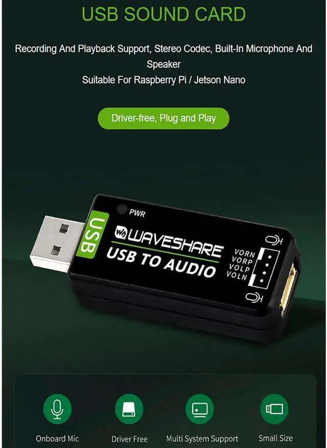 This is a USB sound card that supports recording and playback, a stereo codec, a built-in microphone, and a speaker. It is suitable for Raspberry Pi/Jetson Nano, driver-free, plug-and-play. This kit includes USB TO AUDIO module and 8 5W Speaker. FeaturesOnboard microphone, and speaker header, easy audio input / output. Support "Listening /