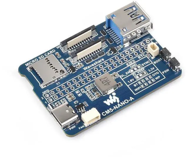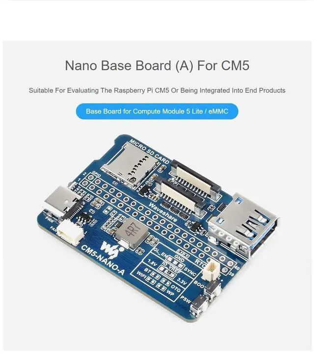 OverviewAs the mini IO board of the Raspberry Pi Compute Module 5, CM5-NANO-A is a baseboard that can be used with the Raspberry Pi Compute Module 5. With powerful features integrated into a compact design, it is only the size of a CM5 with USB 3.2 Gen1 interface onboard. Features and Precautions1. It is forbidden to unplug and unplug any device other than USB when it is charged2. Type C can be used as a USB SLAVE interface to flash images. 3. Onboard default USB 3.2 Gen1 port. 4. The onboard BOOT button, you can press the BOOT button before powering on, and connect to the computer through Type C to let the device enter the flashing mode5.