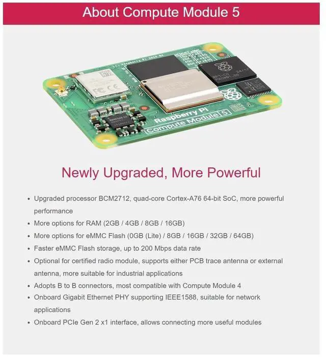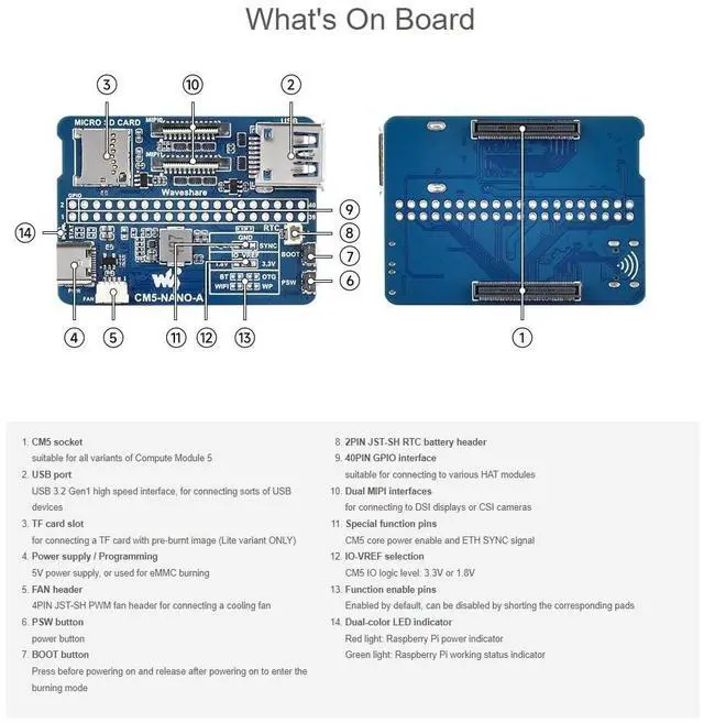 Do not connect other devices when using Type C to flash. Insufficient power supply for burning will cause the device to be unrecognized6. USB TYPE A interface maximum power output 2ASpecificationsCM5 SOCKET---suitable for all variants of Compute Module 5CONNECTOR---Raspberry Pi 40PIN GPIO interface 1USB---USB 3.2 Gen1 Type A port 1MIPI---MIPI 4-lane interface 2 (22pin 0.5 mm FPC connector)STORAGE---TF card socket for Compute Module 5 Lite (without eMMC) variantsPOWER INPUT---5VDIMENSIONS---55 40mmPackage ContentCM5-NANO-A x12*20PIN color-coded straight pinheader x1FAQCan the old versions of the Raspberry Pi operating system be used with CM5? CM5 requires the latest version of Raspberry Pi OS Bookworm (2024-11-19 or later).