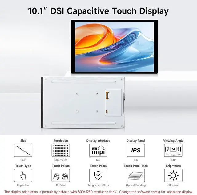 The display orientation is portrait by default, with 8001280 resolution (HV). Change the software config for landscape display. ^^ Integrates the driver circuit into an FPC cable, the total thickness of the LCD is only 10.8 mm ^^ Gently touch, and see what you get, enjoy multi-point UI interaction via flexible operation. Adapting touch function via I2C signal, supports 10-point touch ^^ Excellent Display Performance With 178 Wide Viewing Angle ^^