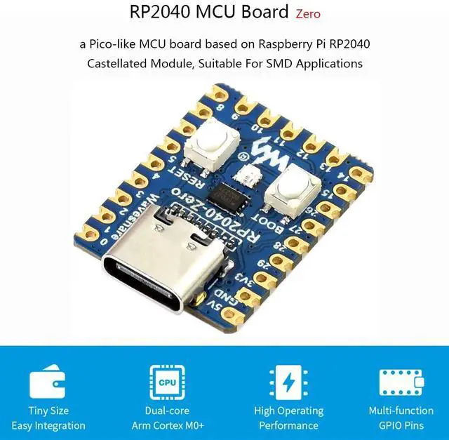 OverviewRP2040-Zero Mini Version, Pico-Like MCU Board Based on Raspberry Pi MCU RP2040, Castellated module, suitable for SMD applications. FeaturesRP2040 microcontroller chip designed by Raspberry Pi in the United Kingdom. Dual-core Arm Cortex M0+ processor, flexible clock running up to 133 MHz. Onboard 264KB of SRAM, and 2MB Flash memory. Type-C USB Connector, keeps it up to date, easier to use. Castellated module allows soldering direct to carrier boards. USB 1.1 with device and host support. Low-power sleep and dormant mode. Drag-and-drop programming using mass storage over USB.