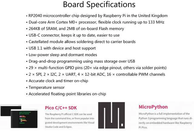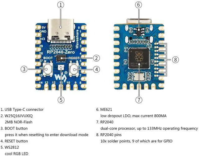29 x multi-function GPIO pins (20x via edge pinout, others via solder points). 2 x SPI, 2 x I2C, 2 x UART, 4 x 12-bit ADC, 16 x controllable PWM channels. Accurate clock and timer on-chip. Temperature sensor. Accelerated floating-point libraries on-chip. 8 x Programmable I/O (PIO) state machines for custom peripheral support. Support C/C++MicroPython. What's On Board1. USB Type-C connector2.