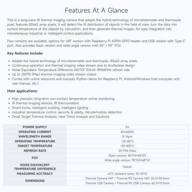 Advanced Hybrid Technology: Combines microbolometer and thermopile pixel technology with 80x62 array pixels, providing precise thermal imaging for various industrial and intelligent control applications.