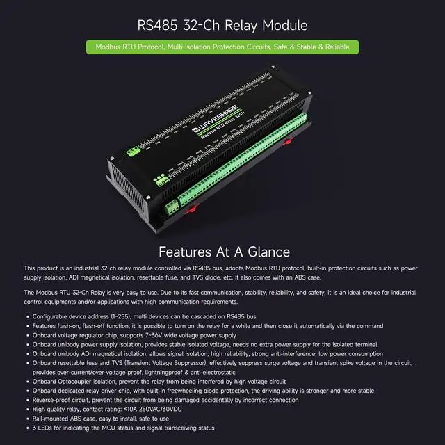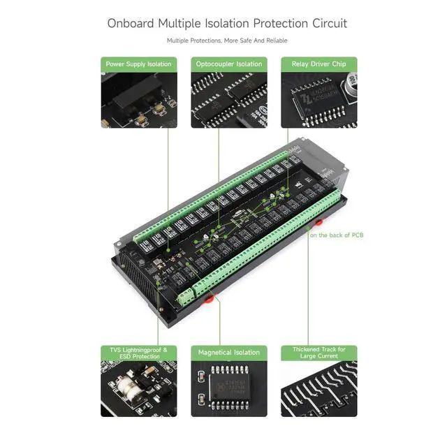 Configurable device address (1~255), multi devices can be cascaded on RS485 bus. Features flash-on, flash-off function, it is possible to turn on the relay for a while and then close it automatically via the command ^^ Onboard voltage regulator chip, supports 7~36V wide voltage power supply. Onboard unibody power supply isolation, provides stable isolated voltage, needs no extra power supply for the isolated terminal ^^ Onboard unibody magnetical isolation, allows signal isolation, high reliability, strong anti-interference, low power consumption. Onboard resettable fuse and TVS (Transient Voltage Suppressor), effectively suppress surge voltage and transient spike voltage in the circuit, provides over-current/over-voltage proof, lightningproof & anti-electrostatic ^^ Onboard Optocoupler isolation, prevent the relay from being interfered by high-voltage circuit.